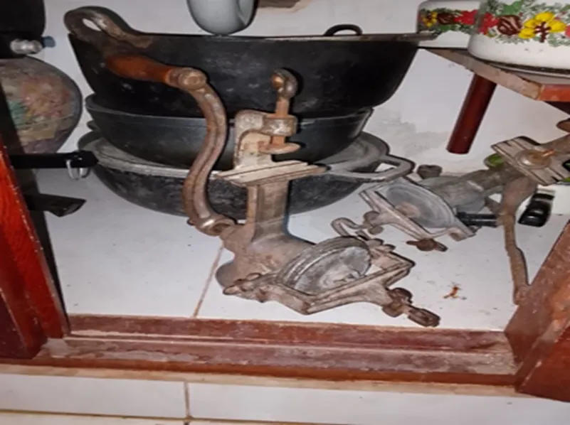 Características, materiales y uso: Hecho totalmente de hierro fundido, con una manivela lateral y una abrazadera que permitía ajustarlo a una mesa o superficie. Se utilizaba principalmente para moler maíz, café o granos secos. Su sistema de engranajes y discos trituraba los alimentos manualmente al girar la manivela.